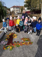 Восени у веселому танку кружляло листя і доки його не прибрали, у малечі був час під час прогулянок змайструвати з нього щось своїми руками. Діти з батьками та педагогами творили на асфальті осінні шедеври із різнобарвного листя і природних матеріалів: шишок, жолудів, гілочок дерев, каштанів, горіхів тощо. І виявилося, що це було захопливе заняття, коли звичайні листочки перетворювалися на равликів, їжачків, ведмедиків, грибочків, парасольок та цілі композиції!! Картини вражали задумами, і, нажаль, їх здувало вітром, та на згадку залишилися фото.   Майстри – вихованці, педагоги та батьки отримали величезне задоволення!!