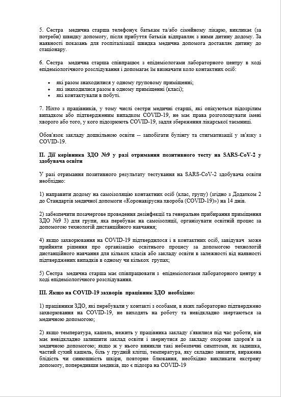 2. Сестра медична старша, або вихователь невідкладно поінформує батьків (інших законних представників) про випадок виявлення ознак. Сестра медична старша має бути забезпечена стандартними засобами захисту, а також повинна дотримуватися заходів безпеки при догляді за особами з підозрою на СОVID-19: носити маску і дотримуватися необхідної дистанції.